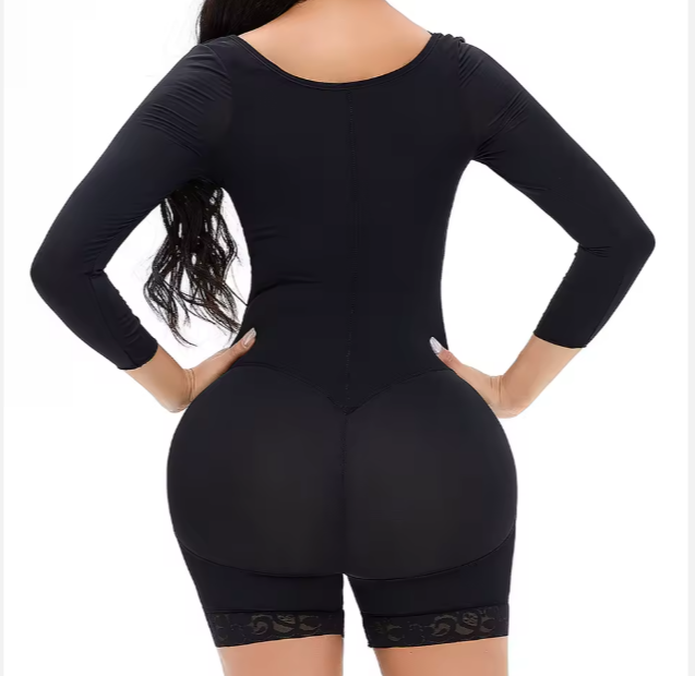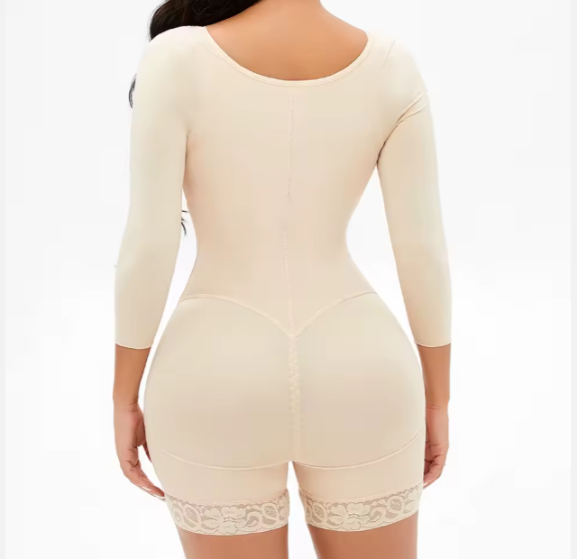 El material especial en la zona de los glúteos (“Butt material”) está diseñado para dar soporte y realce natural, creando un efecto de levantamiento (push up) sin aplanar, las mangas largas ayudan a delinear brazo y antebrazo evitando la piel colgada de los brazos.